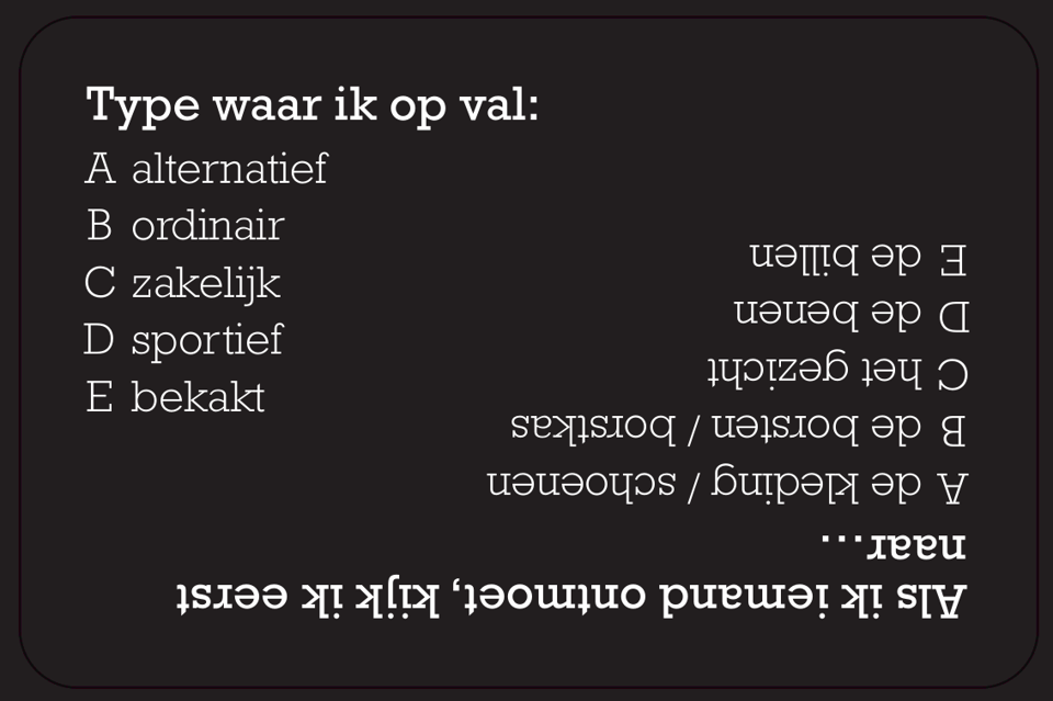 • 1 speler legt de 5 opties (A/B/C/D/E) van een onderwerpkaart in zijn/haar voorkeursvolgorde (links meest van toepassing / rechts minst).
