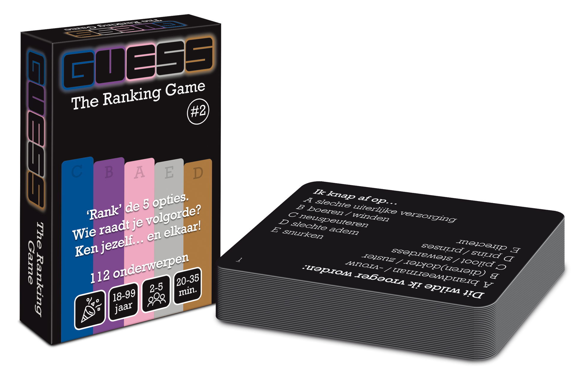 In iedere editie van GUESS The Ranking Game zitten 112 verschillende onderwerpen. Als je beide edities bezit, heb je dus totaal 224 onderwerpen!